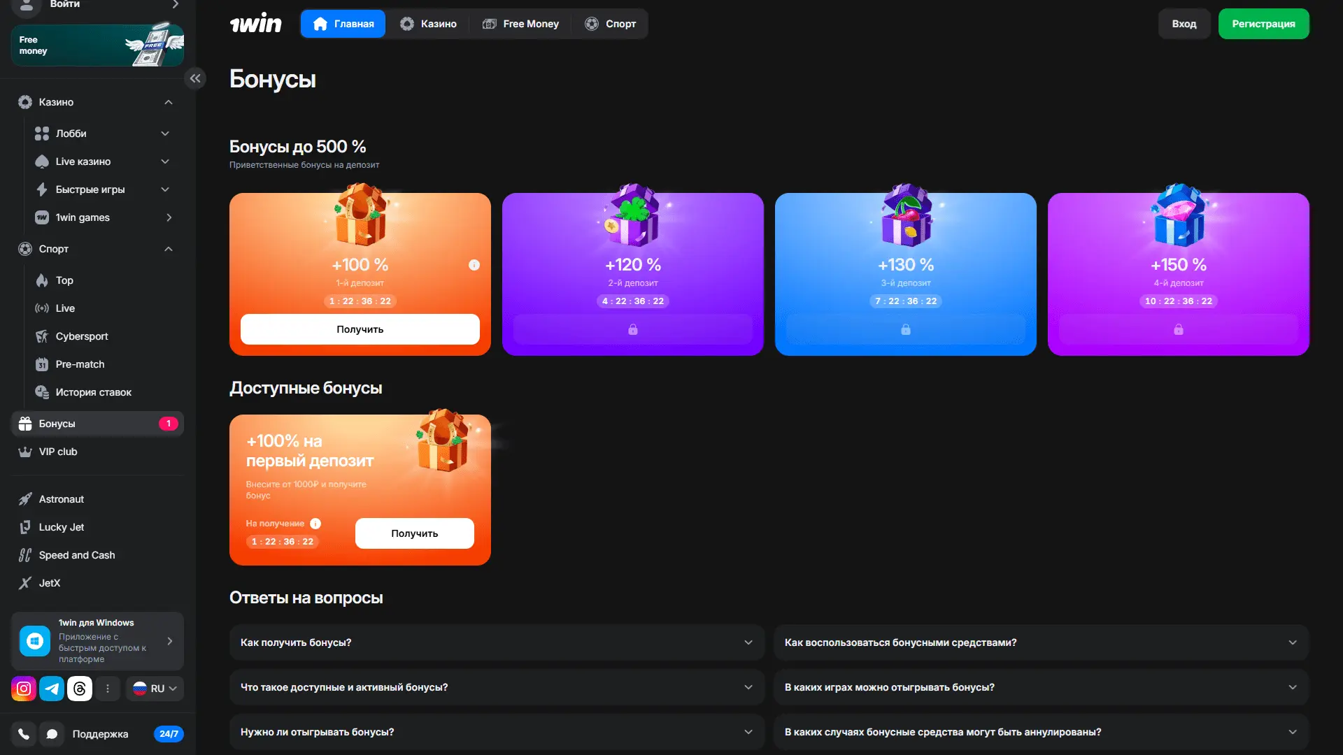 Бонусы 1Win — старт до 500% и фриспины для активных игроков